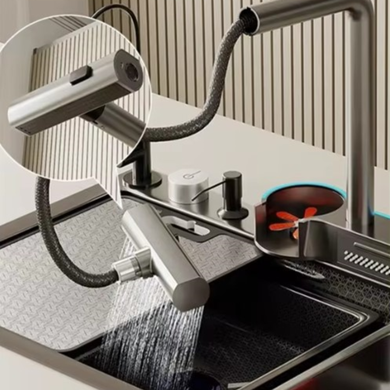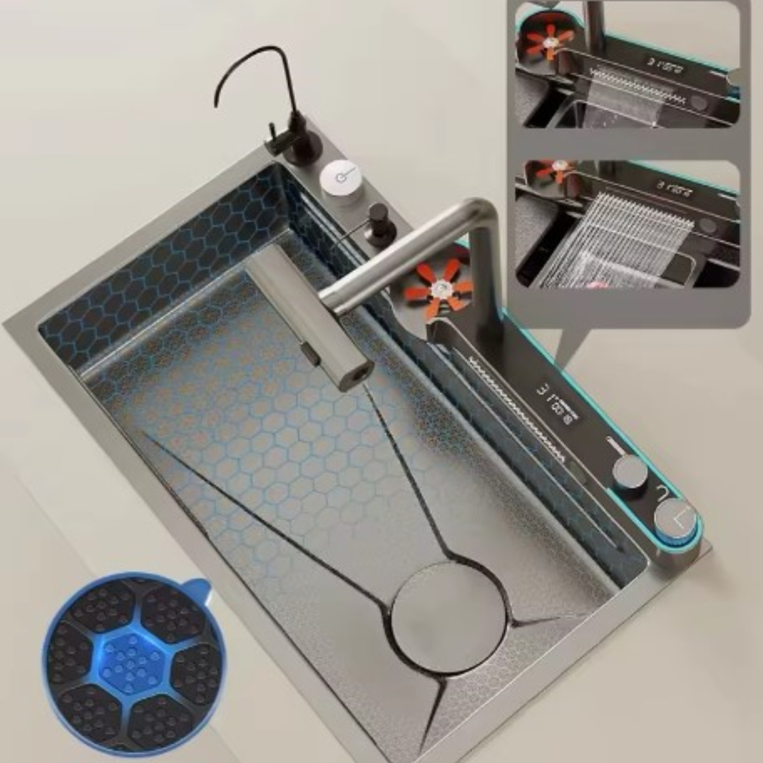 Chiuveta multifunctionala de bucatarie, robinet multifunctional 2 moduri, jet si ploaie, cascada, 2 tavite inox, tocator, rezervor detergent, spalator special pentru pahare, lumina ornamentala, Negru antracit